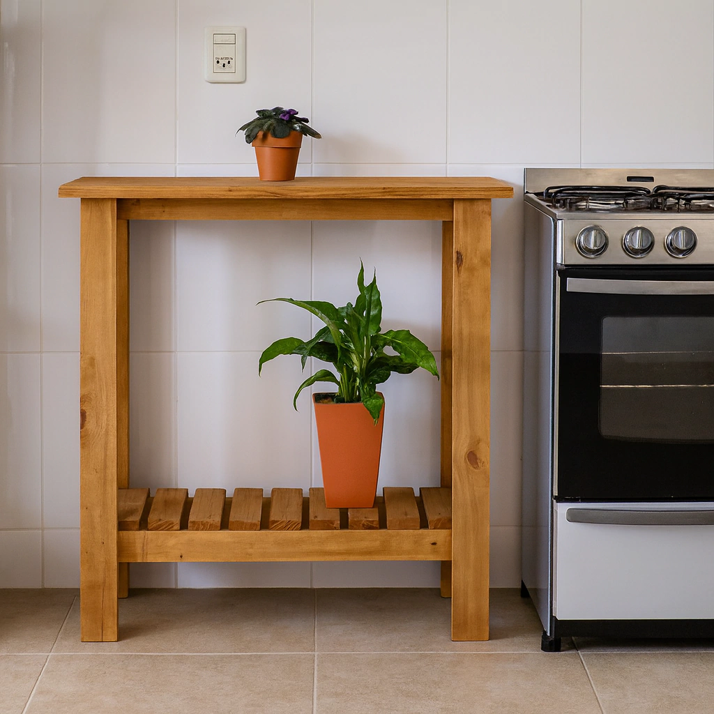 Práctico, moderno y funcional. Hecho en madera maciza y pintado en un elegante tono roble, es ideal para sumar calidez y estilo a tu cocina o comedor.